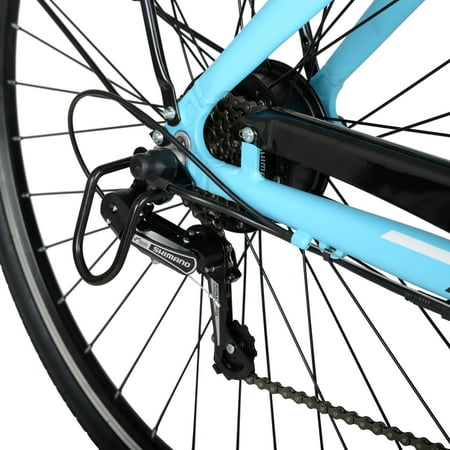 Hyper E-Ride Electric Bike 700C Wheels, 36v Battery, 20+ Mile Range, Blue Frame: 700C aluminum Brakes: front/rear V-brake Forks: suspension Shifting: Shimano grip shifter and Shimano rear derailleur Battery: integrated flush-mount 36V Charging time: 4 hours Run time: 1 hour/20 miles Rider Height: 5’4″ – 6’2″