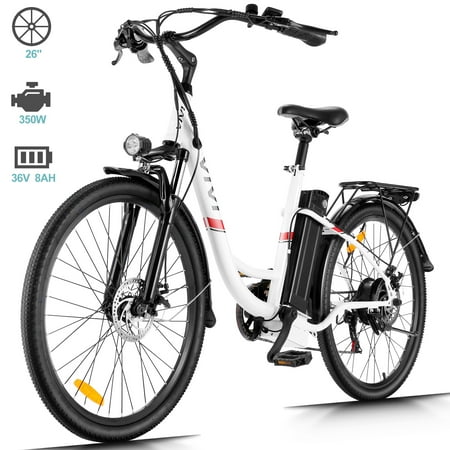 VIVI Electric Bike 350W Electric City Cruiser Bicycle-Max 50 Miles- Removable Battery, Shimano 7-Speed and Dual Shock Absorber, 26″ Electric Commuter Bike for Adults Ebike Enjoy a feature-complete, approachable step-thru, comfort oriented, hybrid electric bicycle with long range removable battery. With all the benefits of the this city bike, It’s perfect for improving commuting experience. You can’t deny that it’s an awesome way to get around. Main Features: Powerful 350W Motor—Electric bike for adults comes equipped with a stronger 350W rear-hub motor, a top speed of 20 mph, and reliable disc brakes. It’ll felt totally viable for daily commuting, and get you to the top of relatively steep climbs without forcing you out of the saddle, and feel super stable on the way back down. no pressure 25° climb. Removable Powerful 36V Battery—the rechargeable battery can support the bike to go 22-25miles (E-Bike Mode) to 44-50 miles (Assisted Mode) . Also, the battery can be taken down to charge conveniently, 4-6 hours per charge. 3 Working Modes & 7-Speed Gears—With good transmission system, you can deal with hills roads. The gears are there to enable us to maintain a comfortable pedaling speed (or cadence) regardless of the gradient or terrain. Low Step-Through Frame—Adjustable handlebar height, handle angle and cushion height make it fit teens and adults. The wide swept-back handlebar helps you keep a relaxed tension-free Joints ergonomic upright riding position. This bike’s inclusive design includes a low step-through frame for easy mounting and dismounting. 26″ Anti-slip Tire—front and rear disc brakes ensure your safety, 26″ Anti-skid anti-vibration tires, wear-resistant anti-skid tread and high-quality shock absorption to help you unimpeded. Considerate Design— the LED display is located conveniently on the handlebars. The display lets you know your speed, and battery status. And the front the high- strength front suspension fork can take your riding comfort.